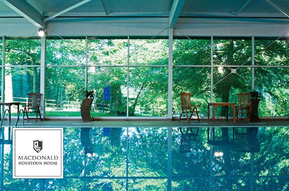 £79 instead of £175 for an overnight stay for two with breakfast, a bottle of Prosecco and leisure access or £109 instead of £225 to include a 3 course dinner at AA Rosette-awarded 4* Macdonald Houstoun House Hotel, West Lothian – save up to 55%