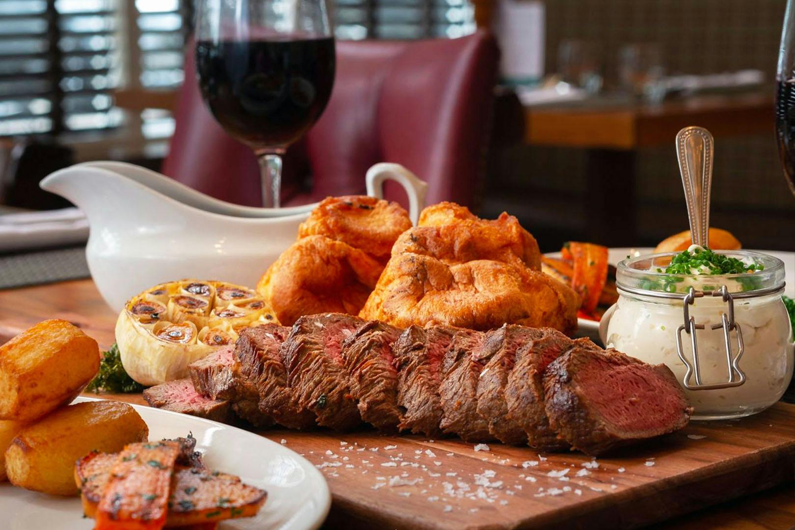Sunday roasting board with all the trimmings for two served in the 2 AA Rosette-awarded restaurant at 4* Macdonald Norwood Hall Hotel; your very own carvery with potatoes, root vegetables, Yorkshire puddings and gravy served right at your table