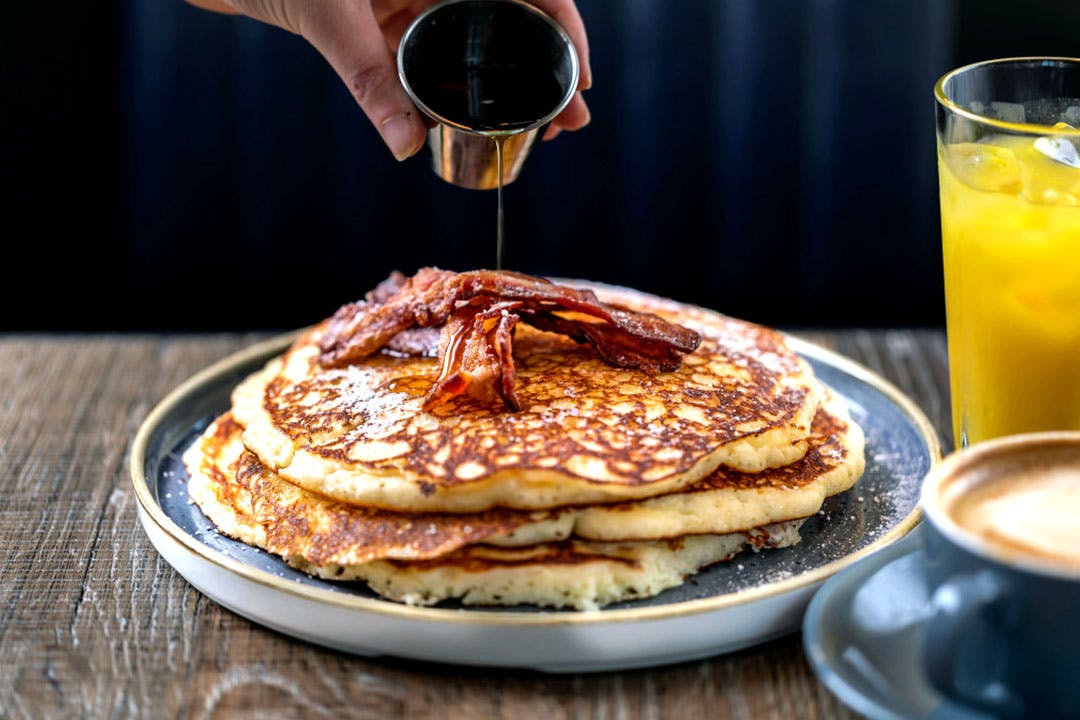 • Bacon & maple syrup pancake stack - three buttermilk pancakes with smoked applewood bacon, whipped butter & maple syrup