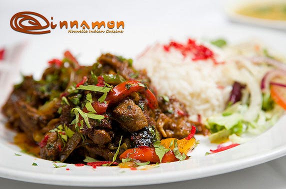 £14 instead of up to £34 for a delicious curry main course plus a portion of rice or naan bread each for two or £18 instead of £43 to add a glass of wine or half pint of beer each at award-winning Cinnamon – save up to 59%