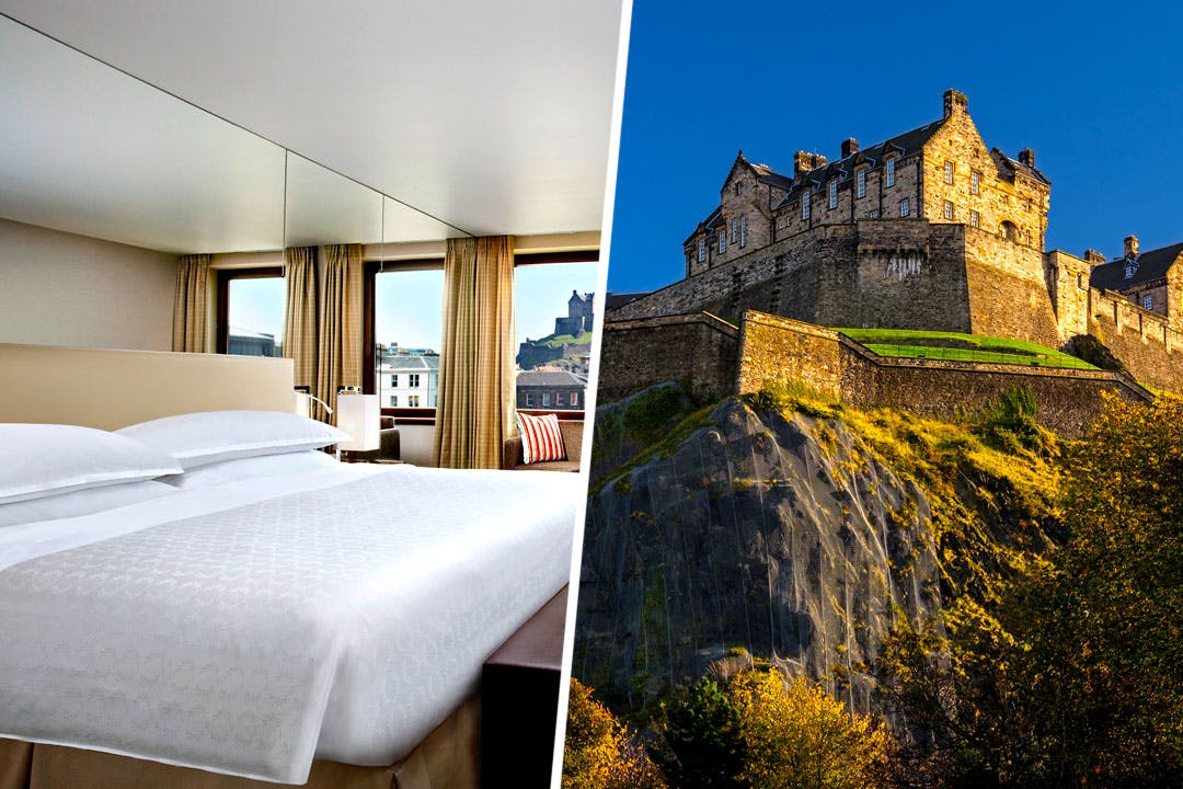 Luxury overnight for 2 with cocktails & an antipasti platter at the 5* Sheraton Grand Hotel & Spa, with views of Edinburgh Castle; soak up the atmosphere in One Square Bar & Terrace, head out to bars & restaurants on George St or go shopping on Princes St