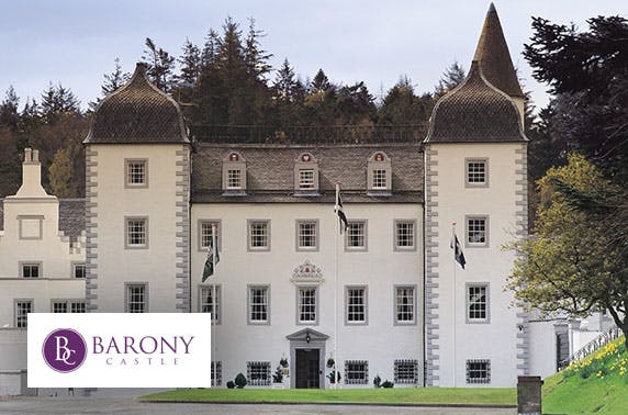 Overnight stay for two with a 2 course dinner, breakfast and a glass of wine each on arrival at Barony Castle, Peebles; stunning castle set in picturesque grounds with an award-winning restaurant - save up to 51%