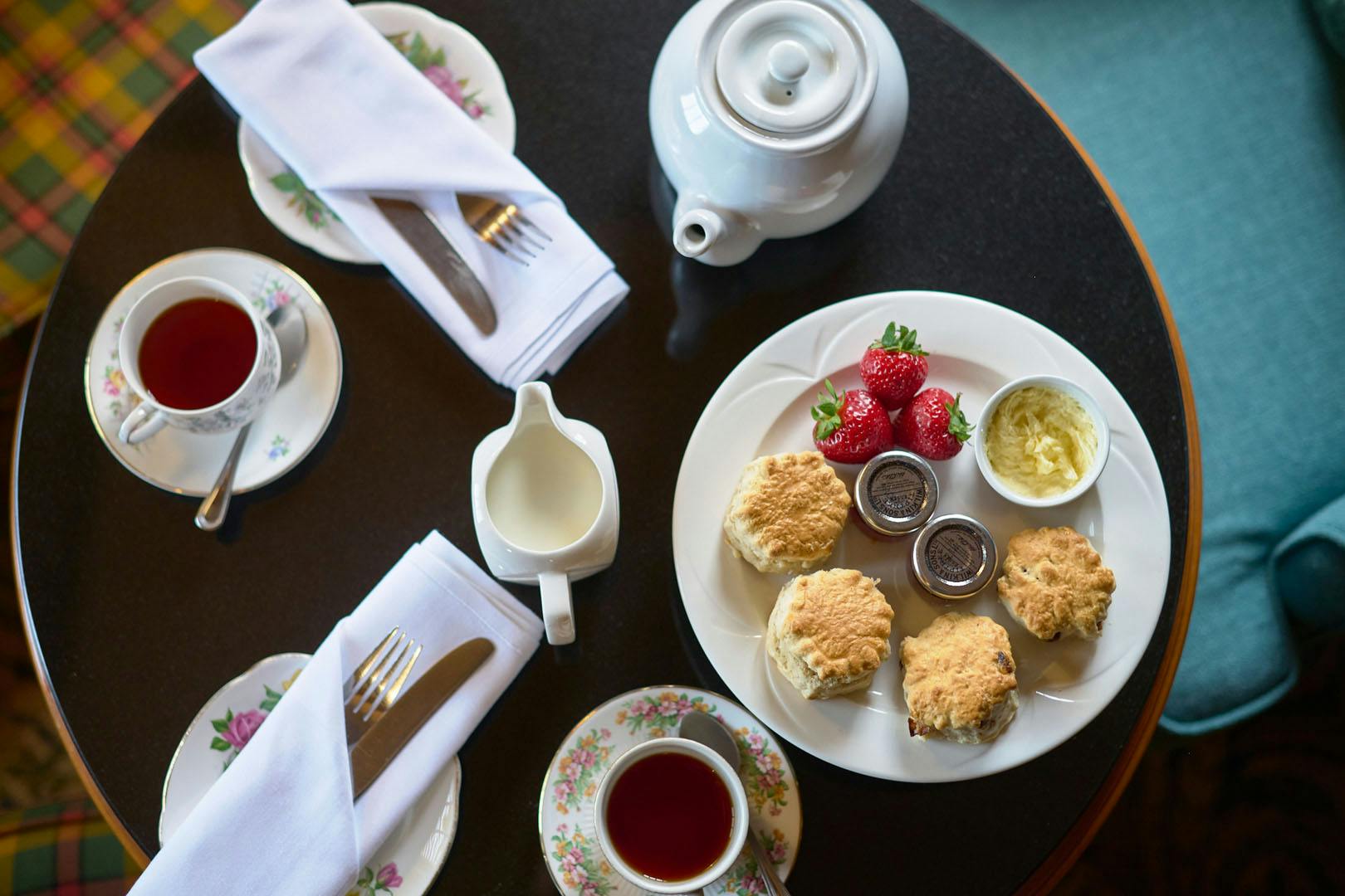 Cream tea for two at Dalmahoy Hotel & Country Club, on the outskirts of Edinburgh; enjoy fresh warm scones with cream & jam served with loose leaf tea and house blend coffee against the majestic 1000 acre woodland backdrop
