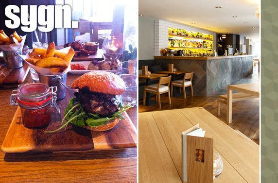 £14 instead of £31 for gourmet burgers with hand cut chips for two OR £25 instead of £62 for four at Sygn Bar choosing any of their mouth-watering burgers plus a tasty Cosmopolitan, Bankside Collins or Naçional Daiquiri cocktail each – save up to 59%