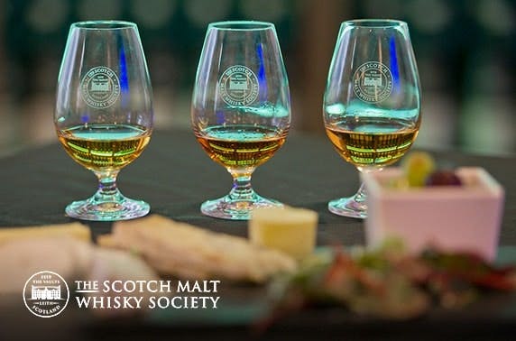Exclusive whisky workshop for one or two at the Scotch Malt Whisky Society including a 45 minute taster session with 3 whiskies, followed by a meal at The Kaleidoscope Bar, or a one year membership for one with a 5 dram discovery pack