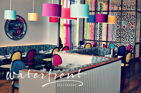 2 courses for two with a bottle of wine to share or for four with two bottles of wine at Waterfront Restaurant within Alea Glasgow; enjoy stunning views across the Clyde - save up to 62%