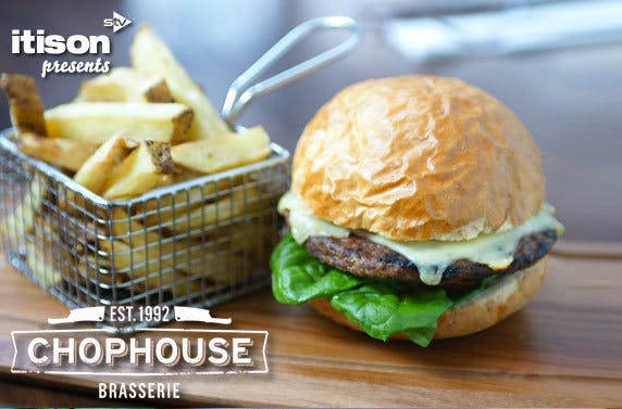 £10 instead of £29 for any burger or ribs with chips for two or £15 instead of £32 for two 7oz sirloin steak with chips and a glass of house wine at The Chophouse Brasserie in The Merchant City - save up to 66%