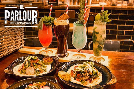 2 cocktails each with a snack to share for two or upgrade to a taco and cocktail each for two or four at The Parlour, West End; tuck into tasty treats from a re-launched menu – save up to 54%
