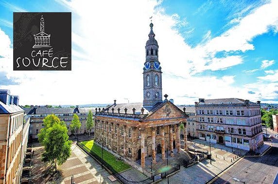 Burgers and sides for two with a glass of wine each, 2 course meal with a glass of wine or beer each or a bottle of Prosecco to share or a chateaubriand with sides plus wine at Cafe Source at St Andrews in the Sq, Merchant City - save up to 58%