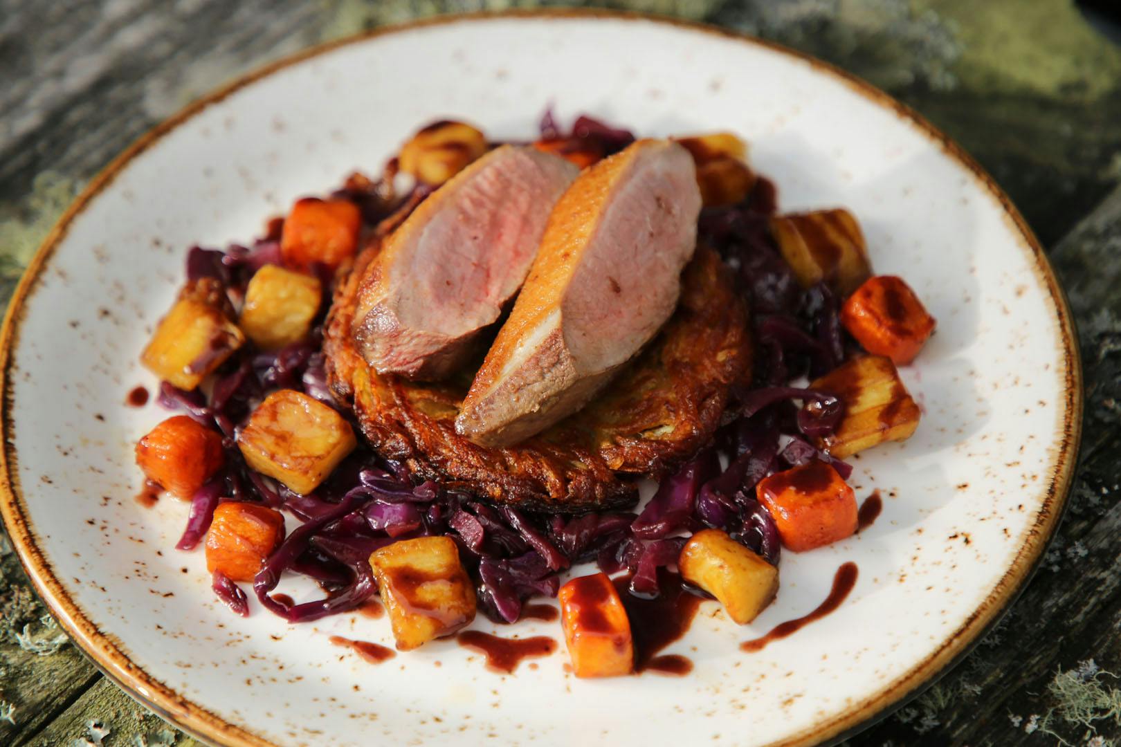 • Roast Gressingham duck breast, confit leg bon bon, celeriac, Hassel back potato and duck gravy