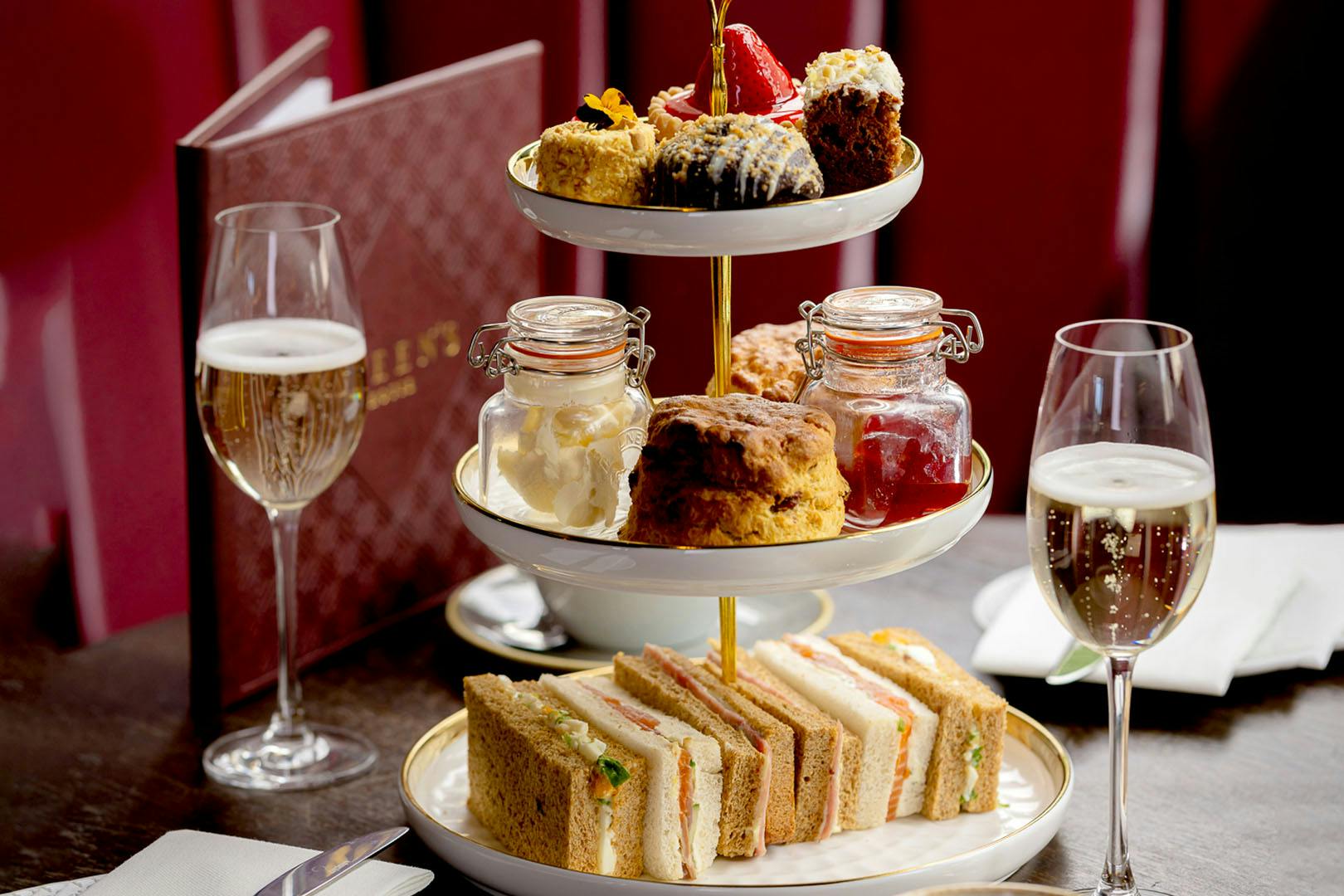 Queen's tea for two with optional fizz at Queen's House, Bridge of Allan; brand-new wine and cocktail bar taking inspiration from Middle Eastern dining - tuck into delicious sweet treats in a cosy booth next to the roaring fire place - save 50%
