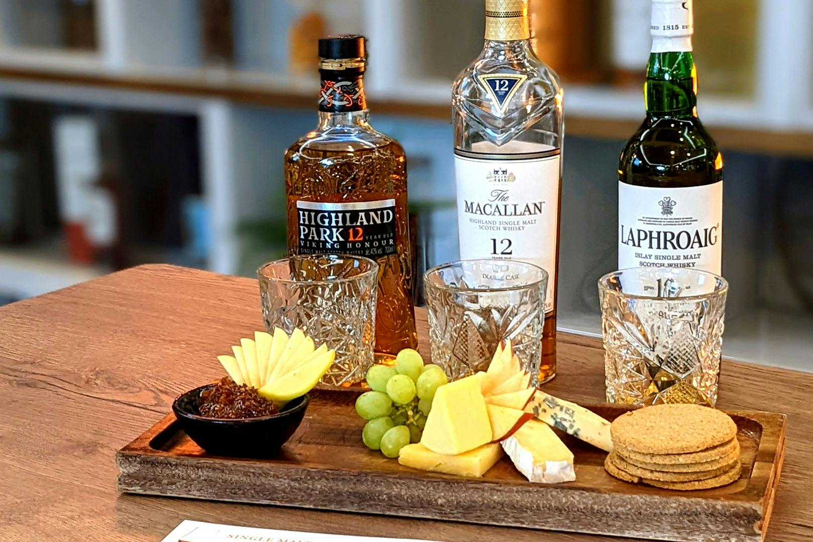 Whisky flight & cheeseboard for two at Whisky Mist Bar & Kitchen in the 4* Hilton Glasgow; with roaring fireplaces & leather booths this old town whisky bar is the perfect spot to cosy up with a wee dram skillfully prepared by expert bartenders - save 55%