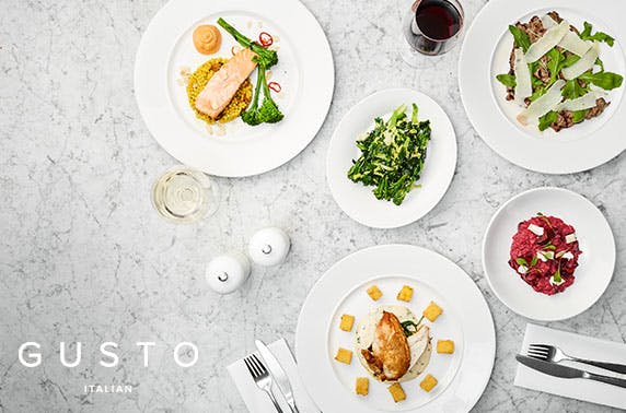 2 or 3 courses for two with optional glass of Prosecco each at Gusto, Quayside; gorgeous restaurant with stained glass and a fairy-lit olive tree - save up to 57%